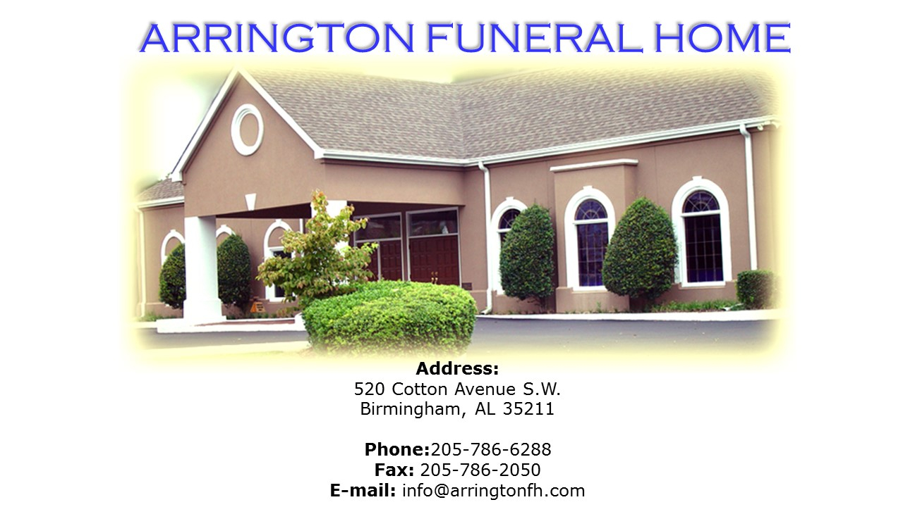 12th at 1100 AM from Arrington Funeral Home Chapel. Birmingham AL 35211 205 786-6288. Arrington Funeral Home Directing.